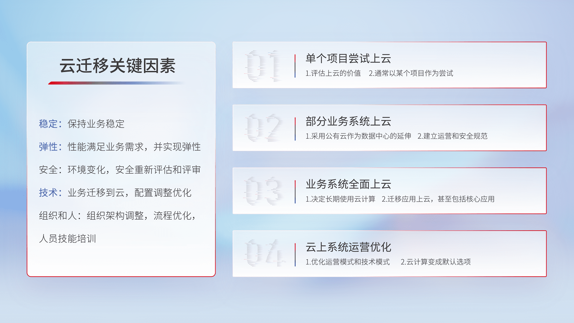 结合实际业务,,从规划设计、、、、云平台选型、、、云原生改造、、、数据迁移、、、、集成交付,,迁移全过程为客户识别最佳上云路径,,做好风险识别管理,,设计网络架构、、、身份权限、、安全审计合规、、、操作审计、、、、日志审计、、监控告警策略、、、多站点容灾设计等,,,对云上基础设施进行整体规划,,提升IT治理水平,,以满足弹性、、、、高可用、、、、高性能的需求。。